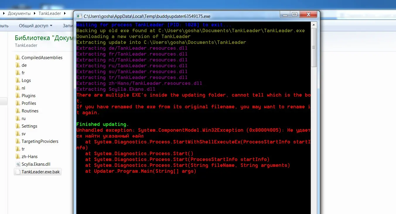 плюс к екзешнику добавляет .bak понятно мне что бэкап, но нового екзешника нет и нет никаких обновлений закрывая окно командной строки бот закрывается тоже. Запускаю по новой то у бота старая версия, и по новой предлагает обновить. А так то бот работает, но хотелось бы обновить.