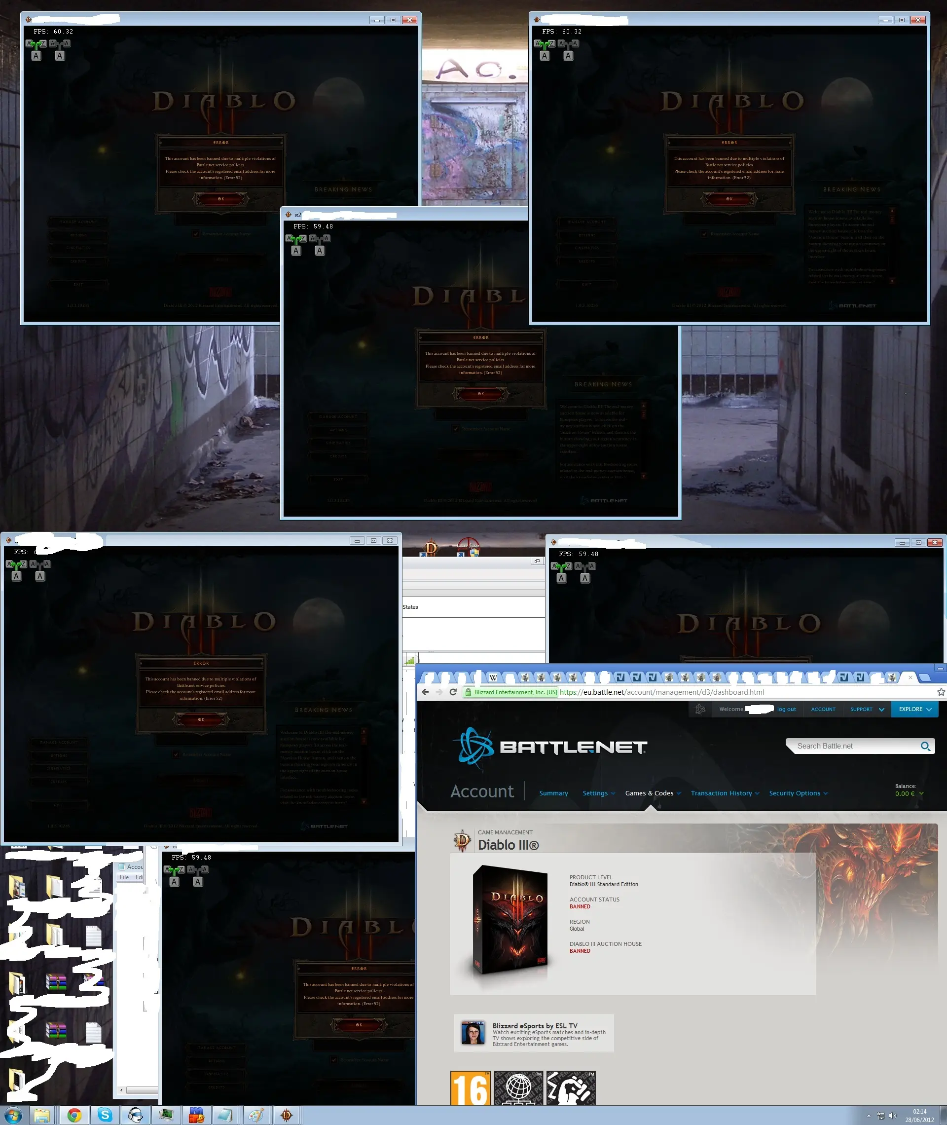 well if you were multiboxing 6 toons without vms, then yeah, unfortunately it is because of that. It doesn't really matter whether or not multiboxing is against the ToS, botting is. I made this mistake myself with wow (ran 9 wows + Pocket Gnomes ) from the same computer (without vms) and all of them got hit. Ever since then, I only multibox max 2 toons per "hardware" (vms spoof all the hardware ids). It comes down to 1). if you are botting for gold/profit with multiboxing 6 d3a from the same "hardware id, ie ethernet ID," and 2). how do u value the ratio of profit per account. If you value the accounts, then i personally only run 2 per hardware id config, if you don't, multibox as many as u can and rake in the cash as long as u can.