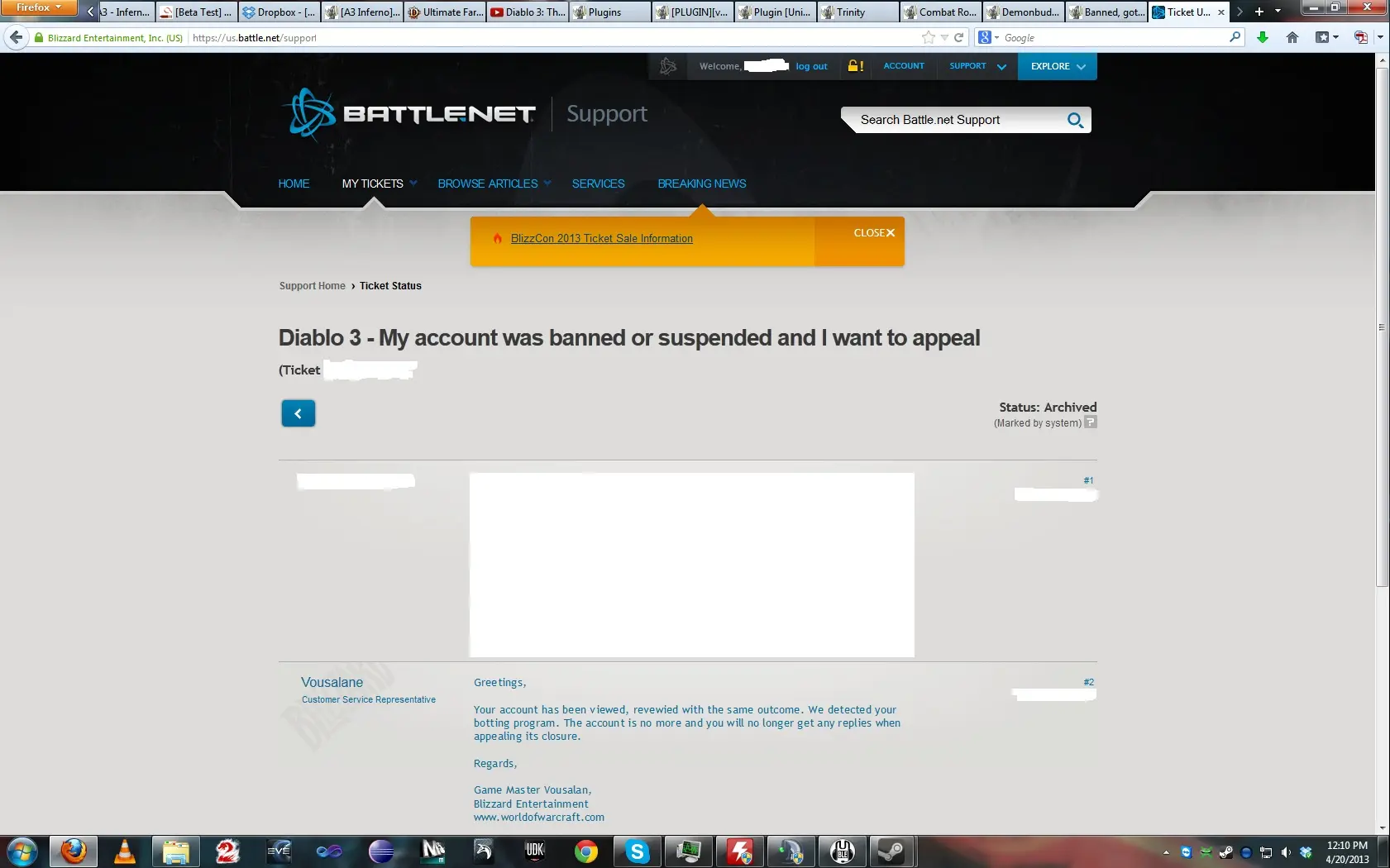 Now I tried petitioning this ban a good 7 times since I kept getting copy/pasted answers, until the 7th and final time, the person snapped at me and simply told me he had detected a bot, whatever. Thus I went to Paypal and petitioned it with them to get my money back (since it was less than 30 days of the purchase and I was "wrongfully" banned). Couple days went by and I was given a message that was sent to me and Blizzard about this petition and that they'd have to give a reason to me, Blizzard never did and Paypal gave me my $40 back from Blizzard.