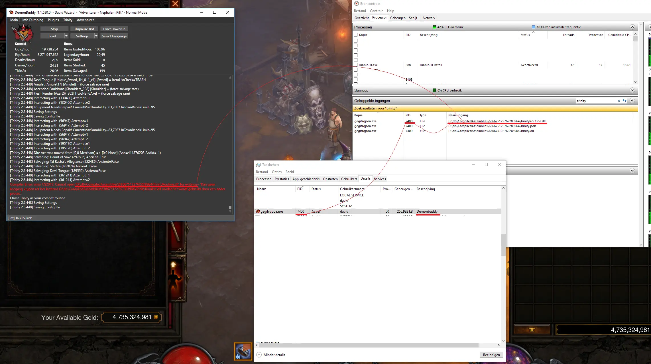 I've used the Windows Resource monitor to check the Associated Handles, it shows me that TrinityRoutine.dll is linked to PID 7400. And PID 7400 is... DemonBuddy!