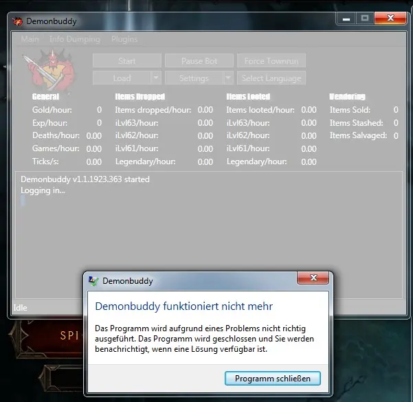 Hello, ... i try to connect with my DB Key ... and than Crash ... =/ [ X ] BuddyWhizard [ X ] Demonbuddy dependency installer nothing work :-/