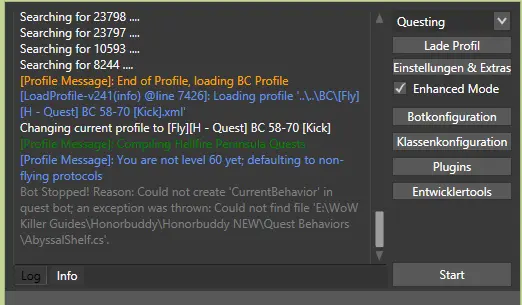 I found a "bug" in the Kick`s Profile, I was questing in Hellfire Peninsula. The bot picked up the quest where you need to fly over the two portals and throw bombs at them, but was not "doing" the quest after it. So i finished it by hand. The quest after that the same problem. He?s questing fine only this two quest are "bugged". View attachment 76982