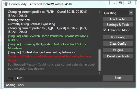2. You cannot use "Questing" as a valid "Mixed Mode" selection. Questing must be done by itself--you may not do it in conjunction with BGs or Dungeons, or anything else. This is because quest state is not properly preserved if you enter and leave a dungeon/BG, and no quest profile writer will support using questing in this fashion.