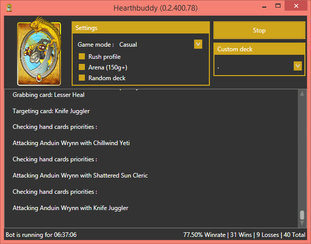 I ran the bot in ranked last 13 hours it made a 48% winrate, 40 wins 43 loses in ranked mode, i use the exact same deck as OP stated including ragnaros. I started rank 19 now im rank 18^^