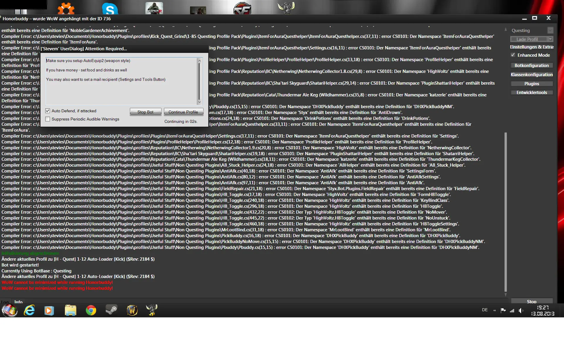 D dlarge500 Member Joined Jun 20, 2013 Messages 141 Reaction score 1 Aug 13, 2013 #2 frisch installieren und die originalen QuestBehavier files nutzen die in HB drin sind, die meisten Coder haben umgestellt oder laden die in seperate Ordner. Die warnmeldung ist normal und dient nur zur Info, einfach auf Continue Bot gehen und fetig.