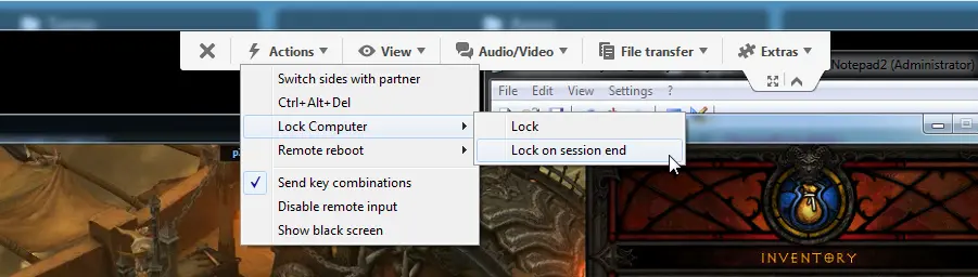 Extra/options/ "show advanced" /advanced settings for connections to other computers/lock remote computer/never
