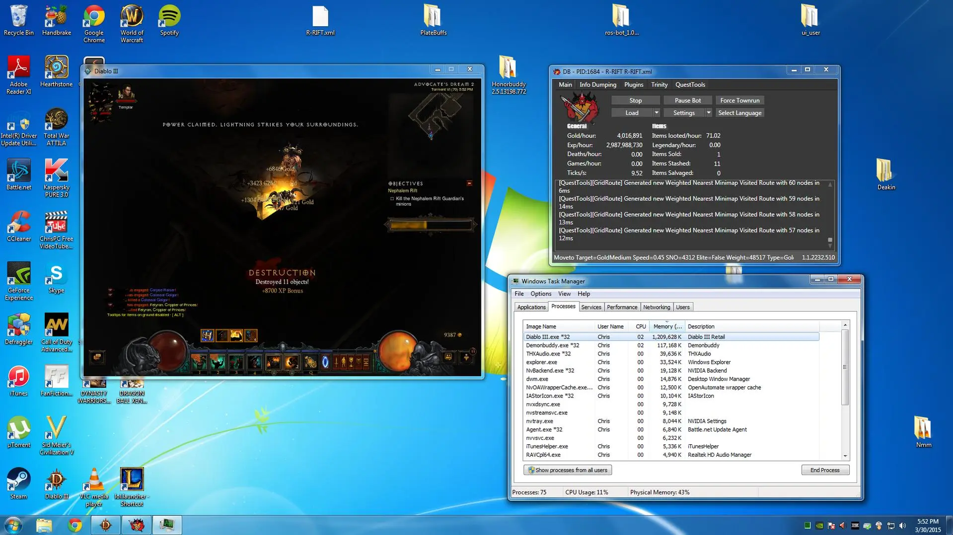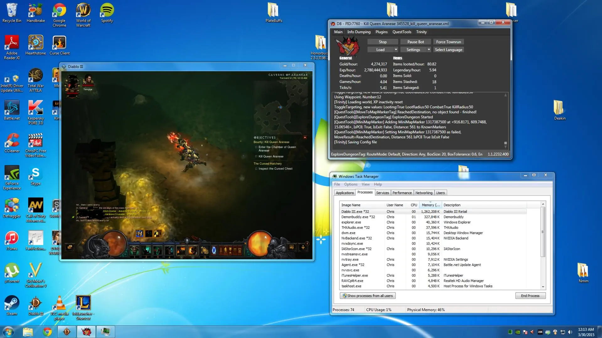 I'm having some issues with my Demonbuddy's TPS. I have "Enable TSP modification" enabled and set to 30, but no matter what I do it still only shows the bot running at 2-5 TPS. I've tried to disable that option entirely, as well as varying the TSP number, but nothing changes. I'm running the latest Trinity Fork (0.8) and QuestTools, and have tried multiple re-installs. I've edited my D3Prefs.txt and run on the lowest possible resolution to maximise efficiency. I have a decent computer, and as you can see in the screenshot attached, neither D3 or DB are using many resources at all. When I play manually I have all graphical settings set to maximum at 1080p resolution and have no FPS issues whatsoever, so this is sort of baffling. Any help with this would be much appreciated!