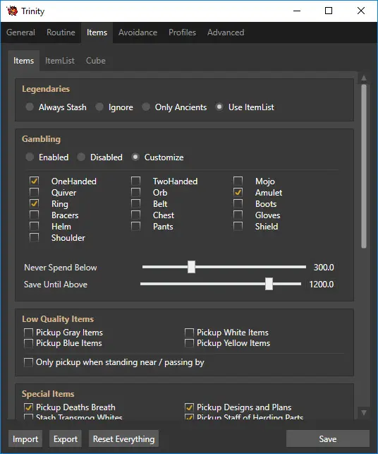 Hello, I am using the most recent Trinity update however I cannot find a setting to change when & how the bot uses blood shards. Currently it uses it on random things except specific item slots I want it to. Can you please let me know how to fix this?