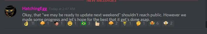 There is no ETA. He has not given any estimated time for product delivery. This is a status update, a progress update, and this is what every clients not on discord have been asking for. ETA can only be estimated once product update is in full swing, and he has not even started any product update yet. They haven't hacked the API yet.