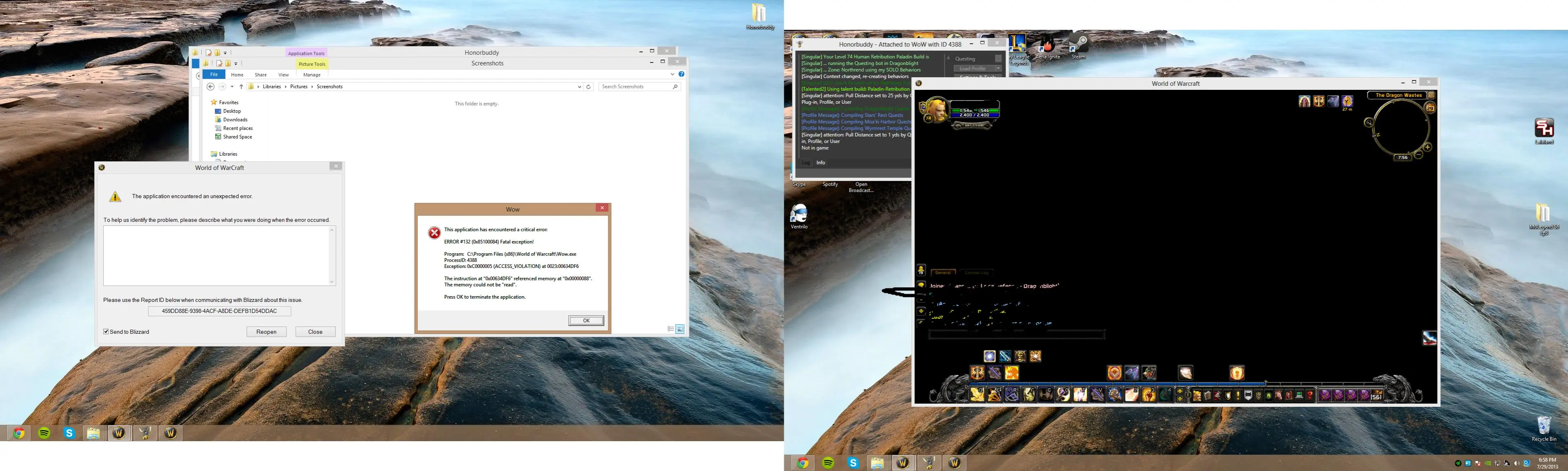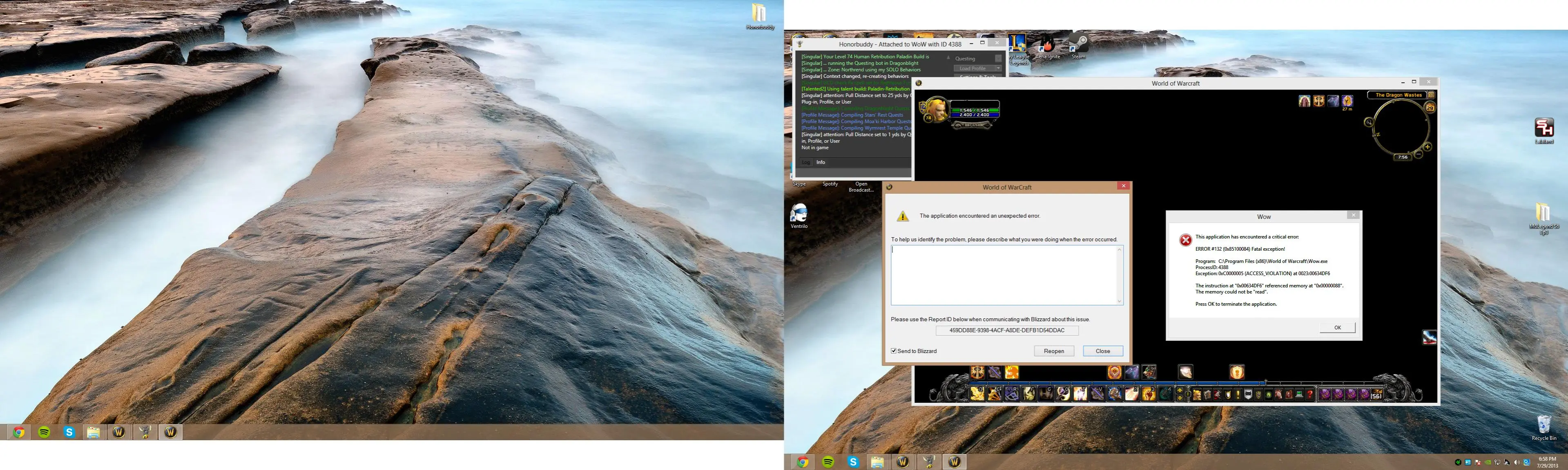 Whenever I start the Quest Bot World of Warcraft window turns black and then I receive a WoW error saying something about Access Violation. I am not sure what to do. Logs are attached. I have not tried BG Buddy yet but i am going to. I will add more info. as I try different things. Thanks. Also sometimes WoW would just disconnect me just found this out.